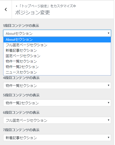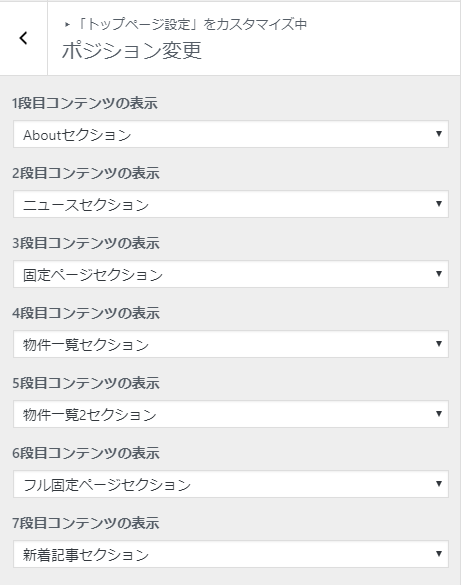 About、News、Contens、物件、物件2、Full Contents、Postの7ブロックそれぞれ表示するものを管理画面から設定し、表示する順番を選択することができます。
